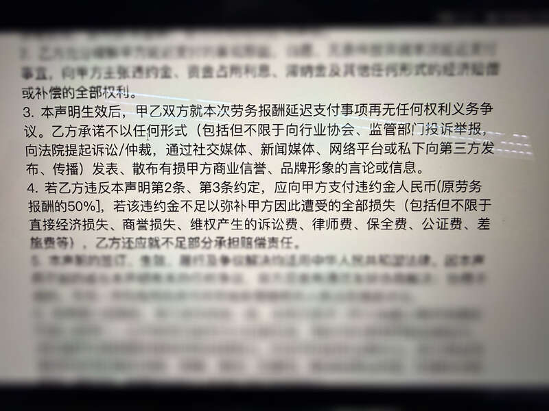 她手中持有的《演员演出合同》载明了拍摄周期、片酬总额及违约金条款,但制作方并未如期付款。多次交涉后,对方发来一份声明要求她签署。其中一项条款声称,双方已于过去某个时间点以“现金”形式结清了全部费用。